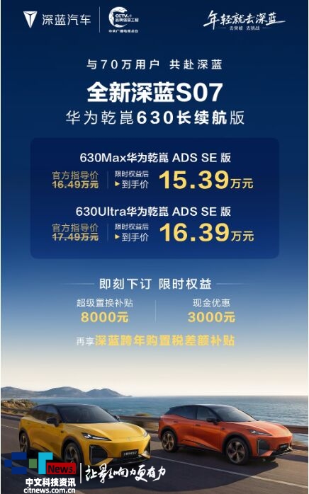 • 長安深藍S07華為乾崑630長續航版上市,售價15.39萬元起